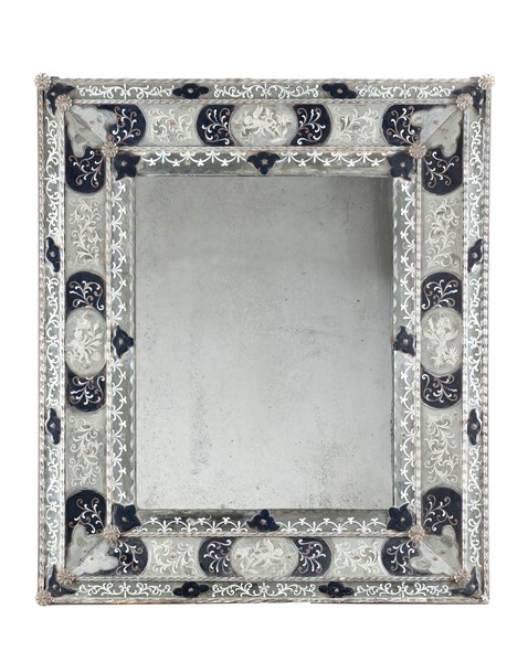 Specchiera di forma rettangolare con cornice a tre ordini in vetri decorati a freddo a volute fogliate e putti alati entro medaglioni. Murano, secolo XIX (cm 80x95) (mancanze)