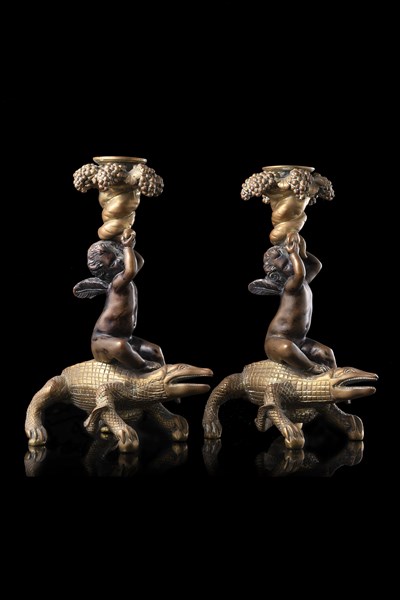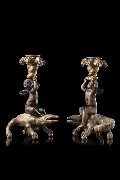 Coppia di candelieri in bronzo con corpo decorato a cherubini a tutto tondo seduti su alligatori. Secolo XIX (h. cm 22) (difetti)