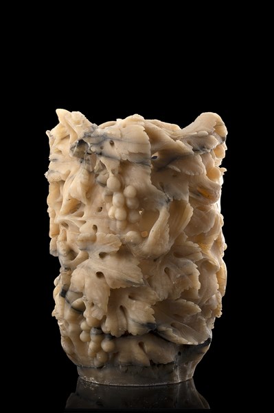 Manifattura orientale, grande vaso in pietra calcarea intagliata, incisa e traforata a foglie di vite