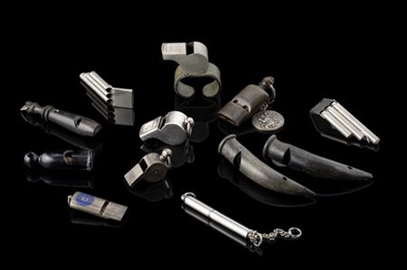Collezione di dodici fischietti in argento, corno e metallo di diverse epoche e