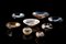 Lotto composto da quattro vaschette e quattro posaceneri in pietre dure tra le quali agata, occhio di tigre e quarzo occhio di falco (cm max 13x8x3) (difetti)