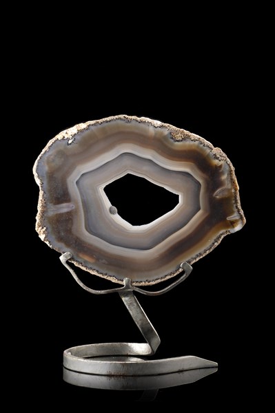 Sezione di quarzo varietà agata (cm 28,5x23,5) poggiante su base in metallo (difetti)
