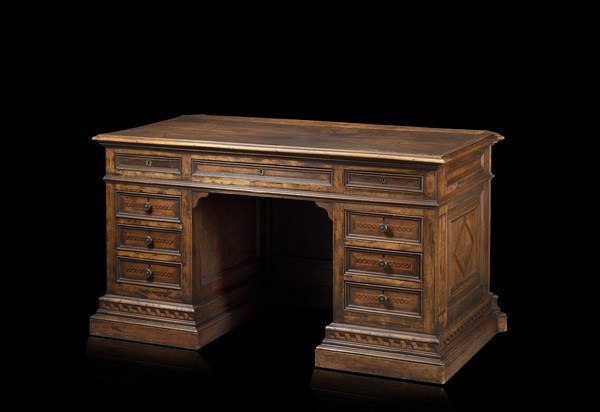 Scrivania da centro a nove cassetti di cui tre in linea con fasce e fronte intarsiati alla certosina, piano sagomato. Secolo XIX/XX (cm 150x80x82) (lievi difetti)