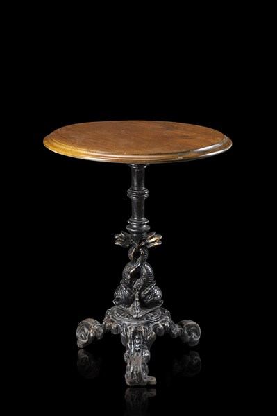 Tavolino con piano in legno di forma tonda su gamba centrale in ghisa modellata ad animali fantastici, tre piedi a ricciolo (cm 58x74) (difetti)