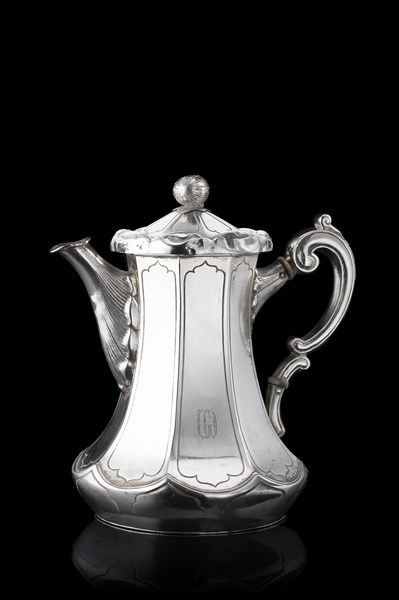 Teiera in argento a corpo piriforme e costolato, presa del coperchio in forma d