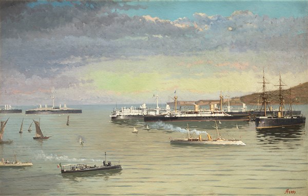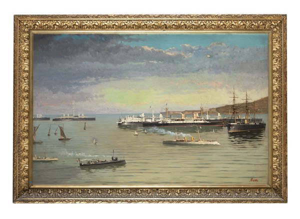 Lotto 859 | Augusto Ferri "Navi al porto" olio su tela (cm 80x124) Firmato in basso a destr