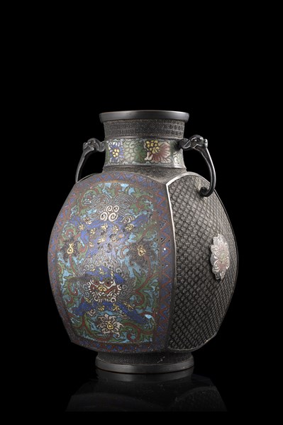 Vaso biansato in metallo cloisonné. Giappone, secolo XIX (h. cm 29,5) (difett