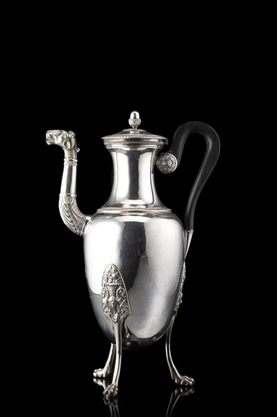 Caffettiera in argento a corpo liscio con bordi decorati a palmette e motivi stilizzati. Versatoio a testa di ariete, piedi ferini cesellati all'attacco a mascheroni e vasi fioriti. Ansa in legno ebanizzato, presa a ghianda. Francia, secolo XIX. Argentiere Naudin Freres (h. cm 30) (g 900 lordi) (lievi difetti)