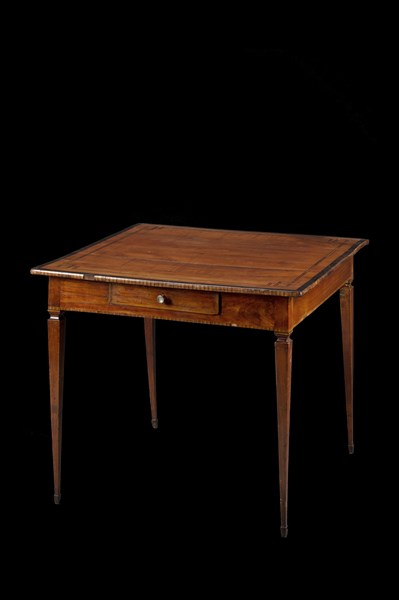 Tavolo lastronato ad un cassetto nella fascia con piano intarsiato a motivi geometrici. Gambe rastremate, datato 1812 all'interno del cassetto (cm 88x76x88) (restauri)