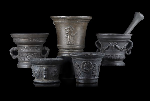 Collezione di cinque antichi mortai di epoche e misure differenti. Uno datato 1