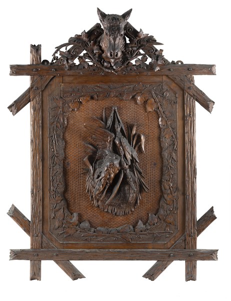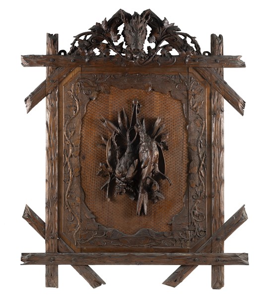 Coppia di pannelli in legno scolpito raffiguranti cacciagione entro cornici intagliate, cimase con teste di animali a tutto tondo. Foresta Nera, secolo XIX (cm 150x110) (difetti e mancanze)
