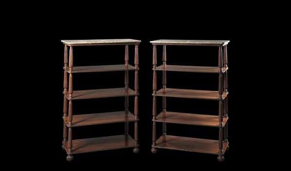 Coppia di étagères a quattro ripiani con colonne tornite e scanalate, fasce a perlinature, piani in marmo lumachella. Liguria, secolo XIX (cm 84x135x48)