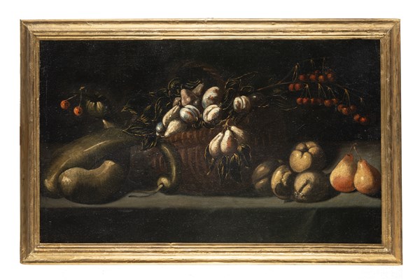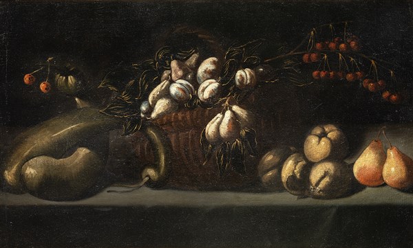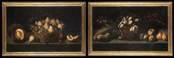 Composizione con zucche e cesta di pere e prugne; Composizione con cesta di prugne, fichi e ciliegie, zucche, pere e mele