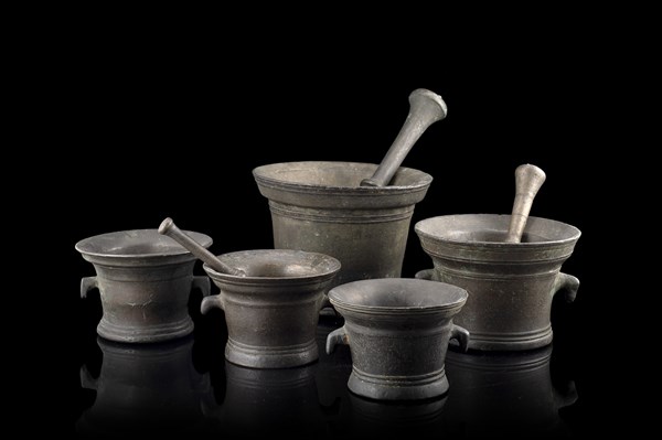 Lot comprising five different bronze mortars, three with pestles (h max cm 16) (defects)