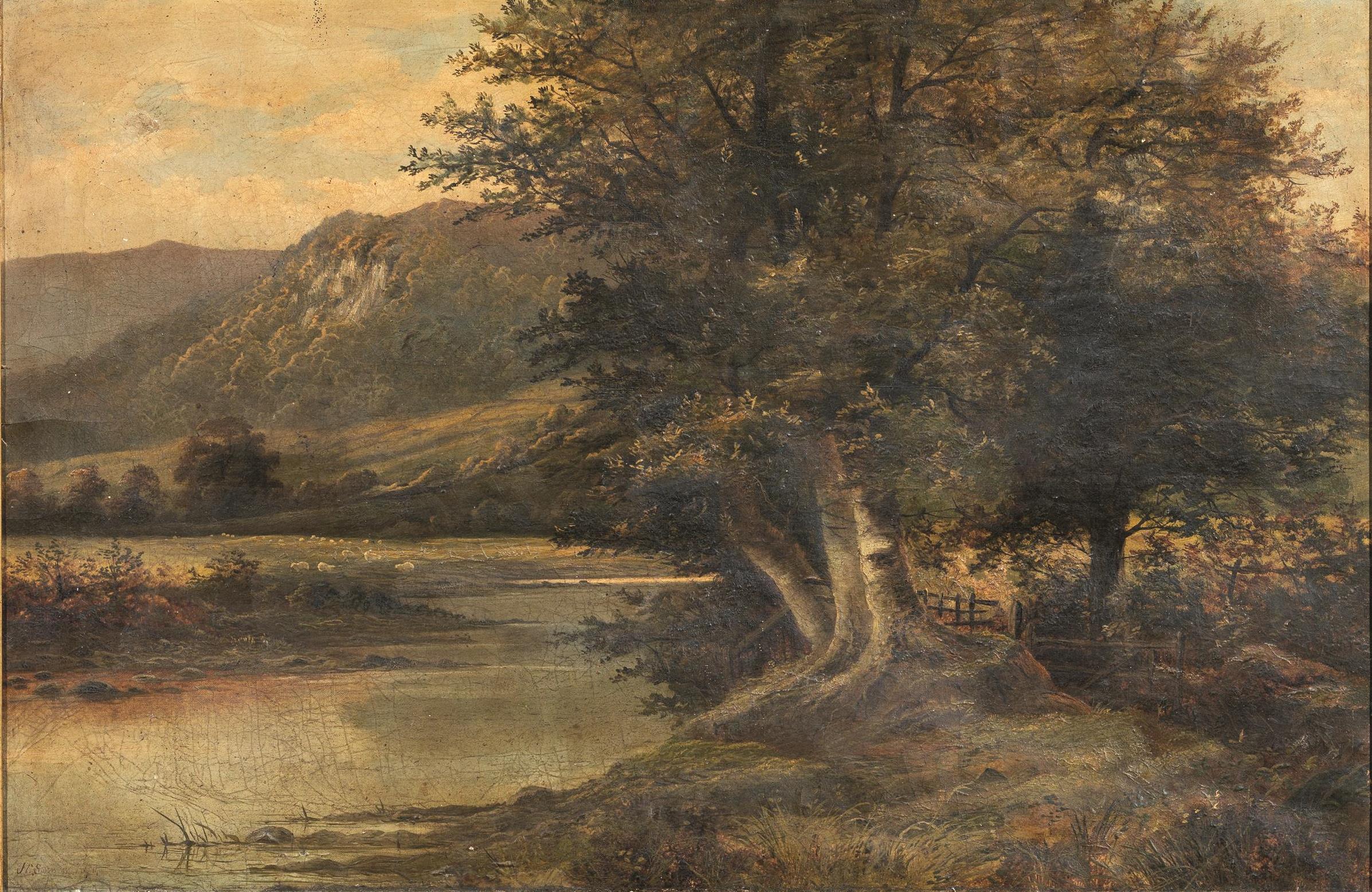 Scuola inglese, sec. XIX PAESAGGIO LACUSTRE olio su tela, cm 51x76...