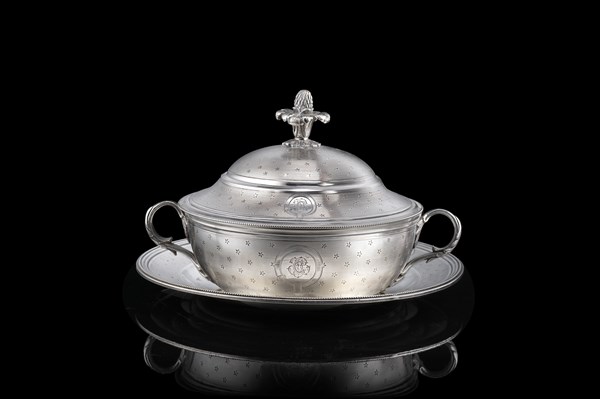 Tazza da puerpera con piatto in argento con interno in vermeille. Corpo cesellato a stelle con monogramma "C", anse a volute fogliate, presa a fiore a tutto tondo. Francia, prima metà secolo XIX. Argentiere Jean François Veyrat (d. piattino cm 19; h. tazza cm 10) (g 590) (lievi difetti)