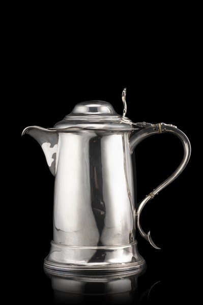 Tankard in argento a corpo liscio con presa sagomata e ghiere in osso. Punzoni