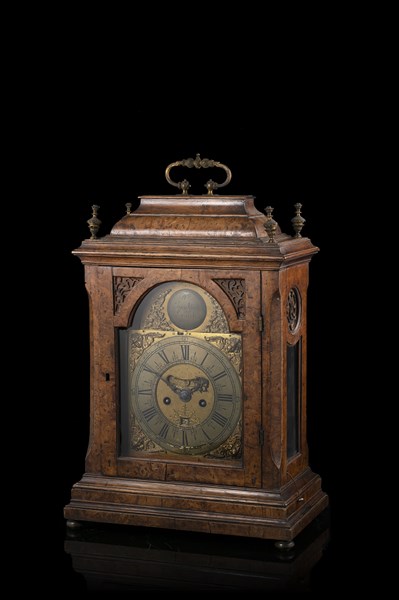 "Bracket" type clock with burr veneered architecturally shaped case (probably not original). Gilt brass plate with silvered dial with Roman numerals and angular gilt bronze bas-relief applications. On the arched top there is an engraved cartouche bearing the name of the clockmaker William Speakman (probably applied in a later period).