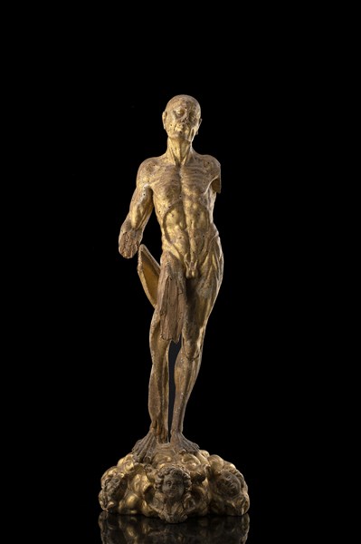 Artist of the 18th century "Saint Bartholomew" giltwood and carved sculpture (h. cm 55,5) (losses and restorations)