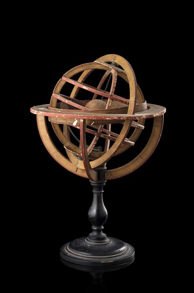 Sfera armillare in legno e carta su piedistallo tornito ed ebanizzato.