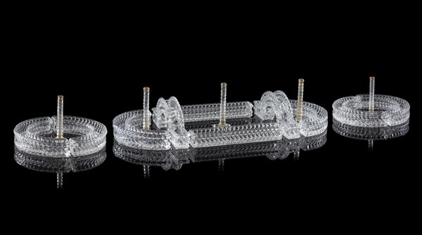 An early 20th-century Baccarat manufacture. Glass centerpiece comprising ten trays and five candlesticks (defects and losses)