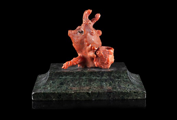 A Trapani 18th-century coral inkwell (h. cm 8,5) On a verde alpi marble base (minor defects)