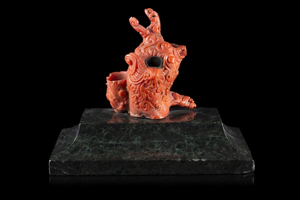 Calamaio in corallo decorato a conchiglie, volute e foglie. Trapani, secolo XVIII (h cm 8,5) Poggiante su base in marmo verde alpi (lievi difetti)