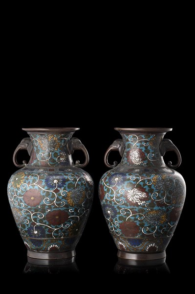 Coppia di vasi in metallo cloisonné con anse a foggia di teste di elefanti. Gi