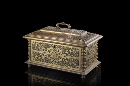 Manifattura del secolo XIX/XX. Cofanetto in bronzo dorato decorato a volute e m
