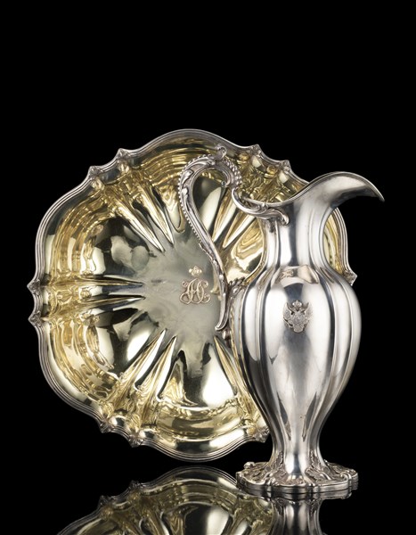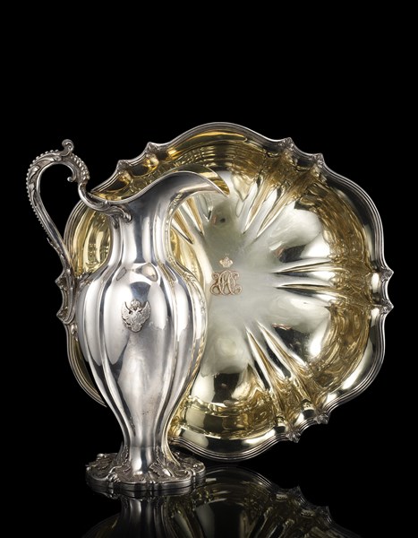 Versatoio con bacile in argento e vermeille a corpo liscio con ansa cesellata a volute e a foglie nella base mossa. Brocca decorata in rilievo con stemma degli Zar e cifre della Gran Duchessa Olga Nikolaevna (11 settembre 1822-30 Ottobre 1892) figlia di Nicola I e di Alexandra Feodorovna. Bacile sagomato con bordura scanalata con foglie cesellate, cavetto in vermeille e cifre coronate in rilievo. San Pietroburgo, argentiere Carl Tegelsten, assaggiatore Dimitry Ilych Tverskoy, metà secolo XIX (h. cm 36,5; cm 37,7x10,7) (g 3870) (lievi mancanze)