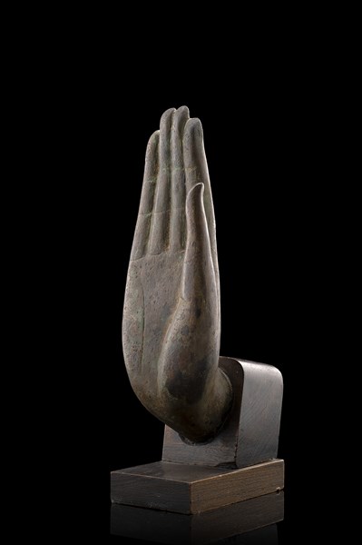 Manifattura del Sud-Est asiatico. Scultura in bronzo raffigurante la mano del Buddha. Poggiante su base lignea (h. cm 21) (lievi difetti)