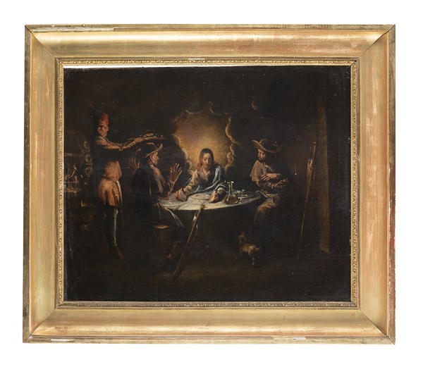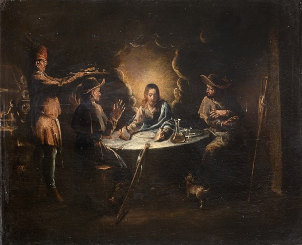 Scuola veneta del secolo XVII Cena in Emmaus Olio su tela, cm 55x69,5 In corni