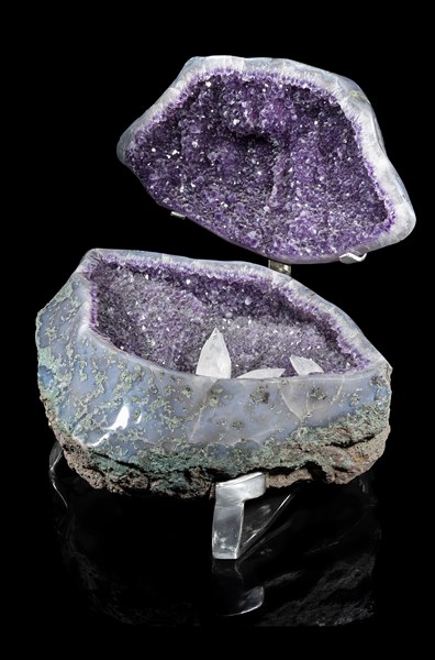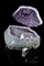 Due geodi in quarzo ametista, uno con crescita di quarzi lattei prismatici (cm