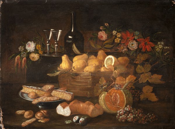 Composizione con cesta di frutta, fiori, zucca, pane e bicchieri