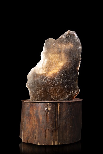 Grande blocco di minerale con quarzo grigio-nero parzialmente trasparente (cm 56x74x20 circa) Poggiante su sezione di tronco (cm 60x43) (difetti)
