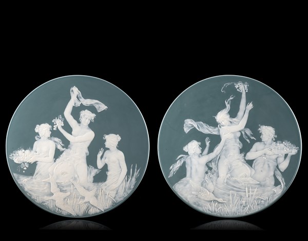 A pair of porcelain plates decorated with classical scenes. Villeroy & Boch manufacture, Mettlach, Germany, 20th century. Signed, marked and numbered on the back 7040-7043 (d. cm 52,4)