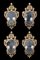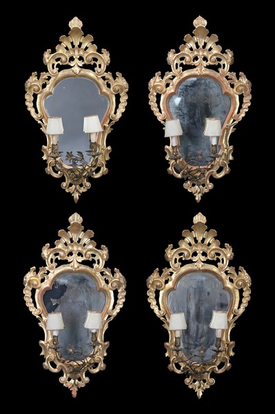 Gruppo di quattro ventole di forma mossa in legno scolpito e dorato a volute e fiori. Braccia in metallo a due luci. Secolo XIX (h. cm 95) (difetti e restauri)