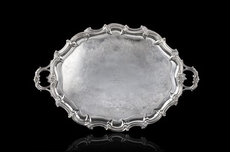 Vassoio biansato in argento con bordo sagomato e corpo cesellato a fiori e volute centrato da stemma con dedica a Theodore Dickens datata 1844. Secolo XIX. Argentieri Lattery Brothers (cm 79x53) (g 6240)