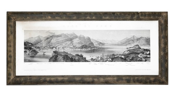 Incisione raffigurante scorcio del Lago di Como a volo d'uccello su disegno di Gaetano Gariboldi con indicate località e ville presenti. Edizione Artaria per Vallardi, Milano, secolo XIX (mm 400x120) In cornice