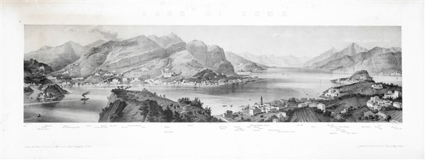 Etching depicting a view of Lake Como on a design by Gaetano Gariboldi. Artaria edition for Vallardi, Milan, 19th century (mm 400x120) Framed