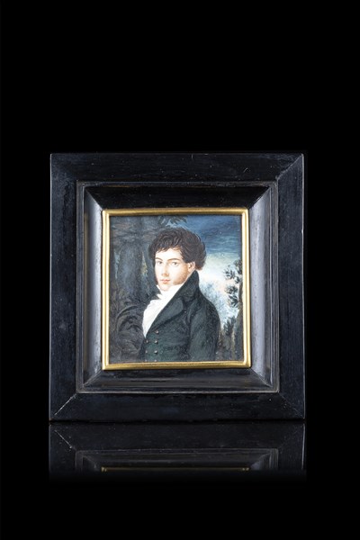 Maestro della fine del secolo XVIII - inizio secolo XIX "Ritratto di gentiluomo in un paesaggio" miniatura su avorio (cm 6x5,5) In cornice ebanizzata
