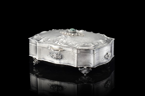 Scatola di forma sagomata in argento sbalzato, cesellato e decorato a fiori. Co
