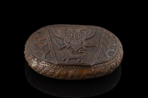 Tabacchiera di forma ovale in legno scolpito e decorata sul coperchio con lo stemma della Russia dell'aquila bicipite inscritto HI. Nicola I (1796-1855) Firma incisa all'interno del coperchio (cm 12x3x8,5) (lievi difetti)