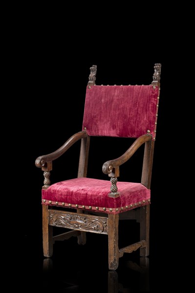 Seggiolone in noce intagliato con braccioli terminanti a ricciolo, finali e fascia decorati a volute fogliate. Secolo XVII (cm 62x144x58) (difetti e restauri)