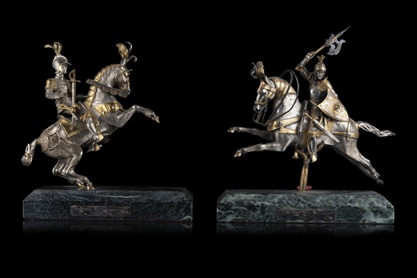 Argentiere del secolo XX "Roberto di Sanseverino" e "Ferdinando Arciduca del Tirolo" due figure a tutto tondo in argento con dettagli in argento dorato. Basi in marmo (h. cm 18,5) (difetti)