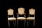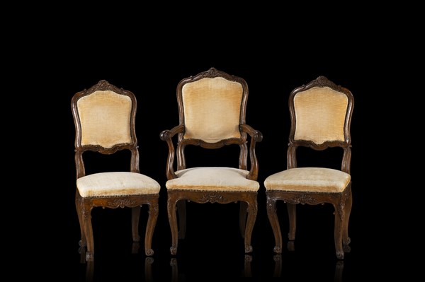 Lotto composto da una poltrona e due sedie di forma mossa in noce intagliato a volute e foglie, braccioli e piedi a ricciolo. Secolo XVIII (difetti e restauri)