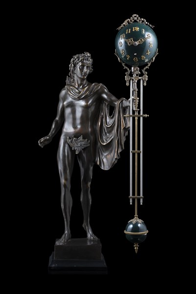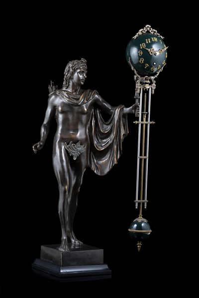 Mystery swinging clock with a bronze sculpture that supports the clock/pendulum.