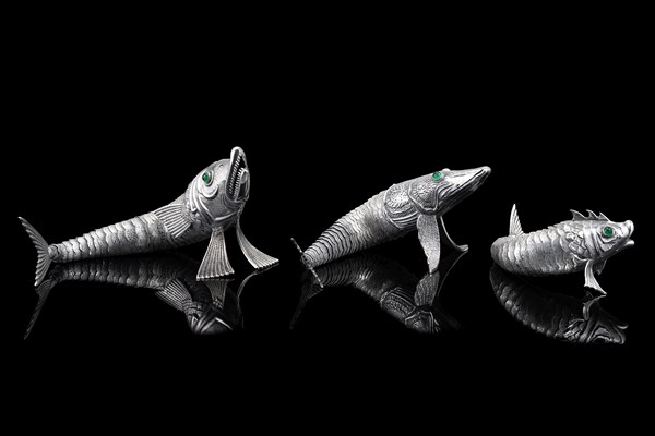 Lotto 1005 | Gruppo di tre pesci snodabili in argento con occhi in pasta vitrea. Punzoni con