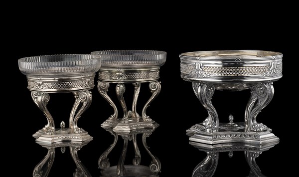 Lotto 1007 | Lotto composto da tre alzate in argento con bordure traforate poggianti su pied