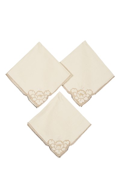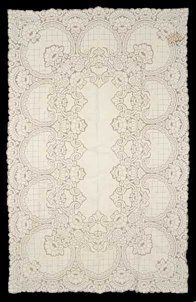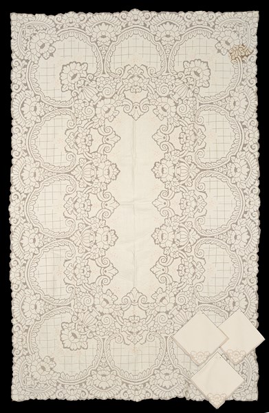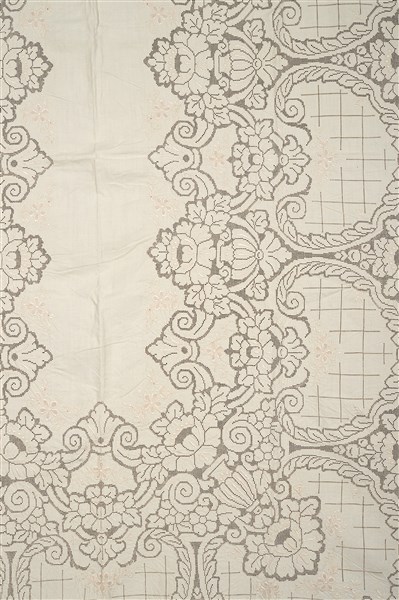 Linen tablecloth. Decoration made using the unthread technique, depicting flowers, oval angular reserves and oval floral motifs. Included eleven linen napkins, worked with the same technique (cm 248x160) (Defects and stains)